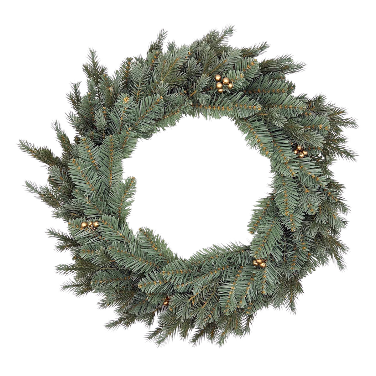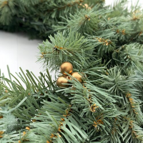 Coronita este realizata din brad artificial dens, cu textura realista si accente discrete aurii, care adauga o nota eleganta fara a incarca decorul. Ramurile sunt distribuite uniform, oferind volum si aspect autentic. Poate fi folosita simpla sau personalizata cu funde, globuri, panglici si mini instalatii.
