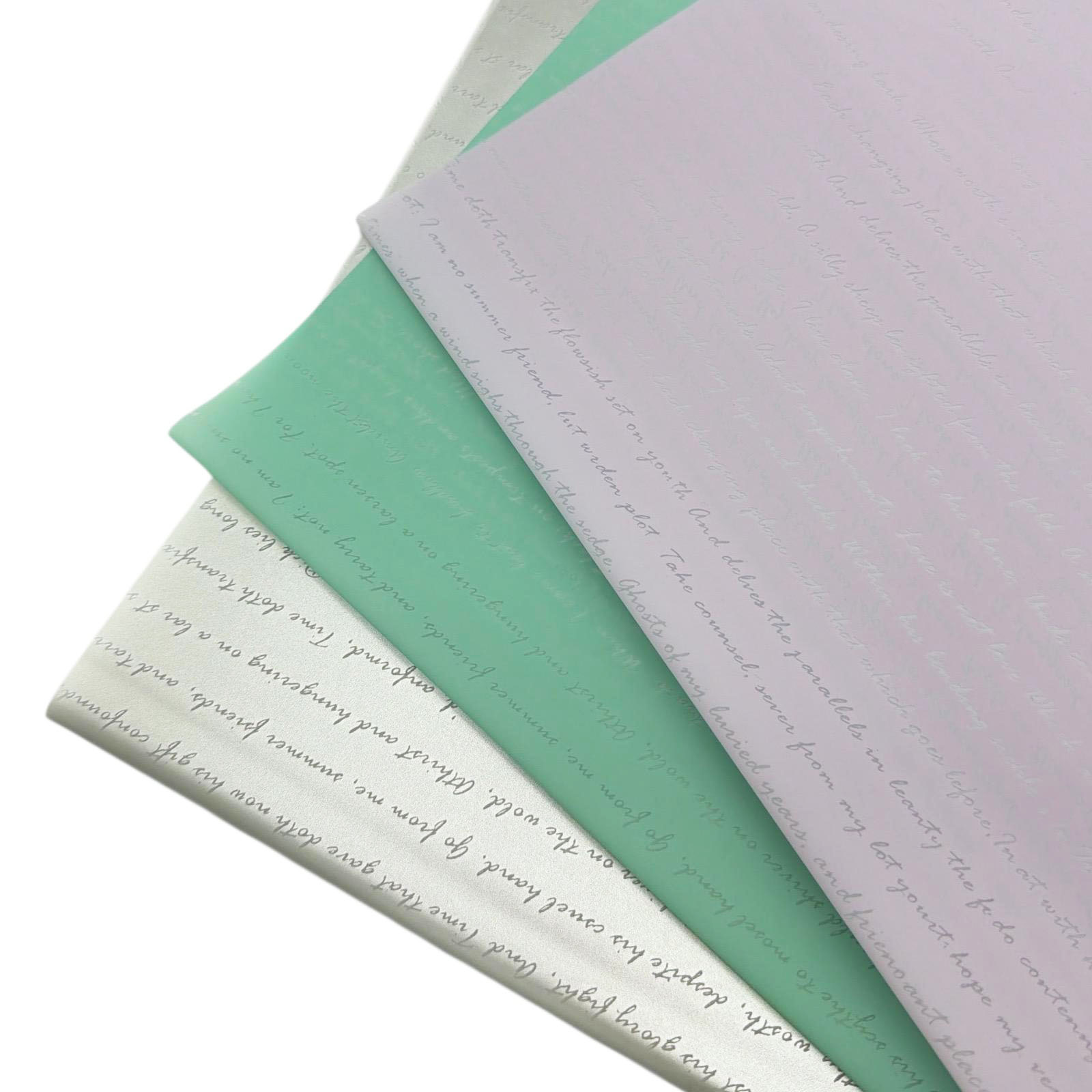 Setul de 20 coli celofan ambalaj flori Small Alphabet Paper este alegerea ideala pentru florarii care cauta un ambalaj de celofan pentru flori elegant, modern si perfect finisat. Textura fina cu imprimeu tip „alfabet” ofera un aspect rafinat buchetelor si aranjamentelor florale, iar culorile premium: Silver, Tiffany Blue si Purple, adauga un plus de stil oricarei lucrari florale. Ambalajul este rezistent, maleabil si perfect pentru ambalarea profesionala a florilor, cadourilor si decorurilor florale.