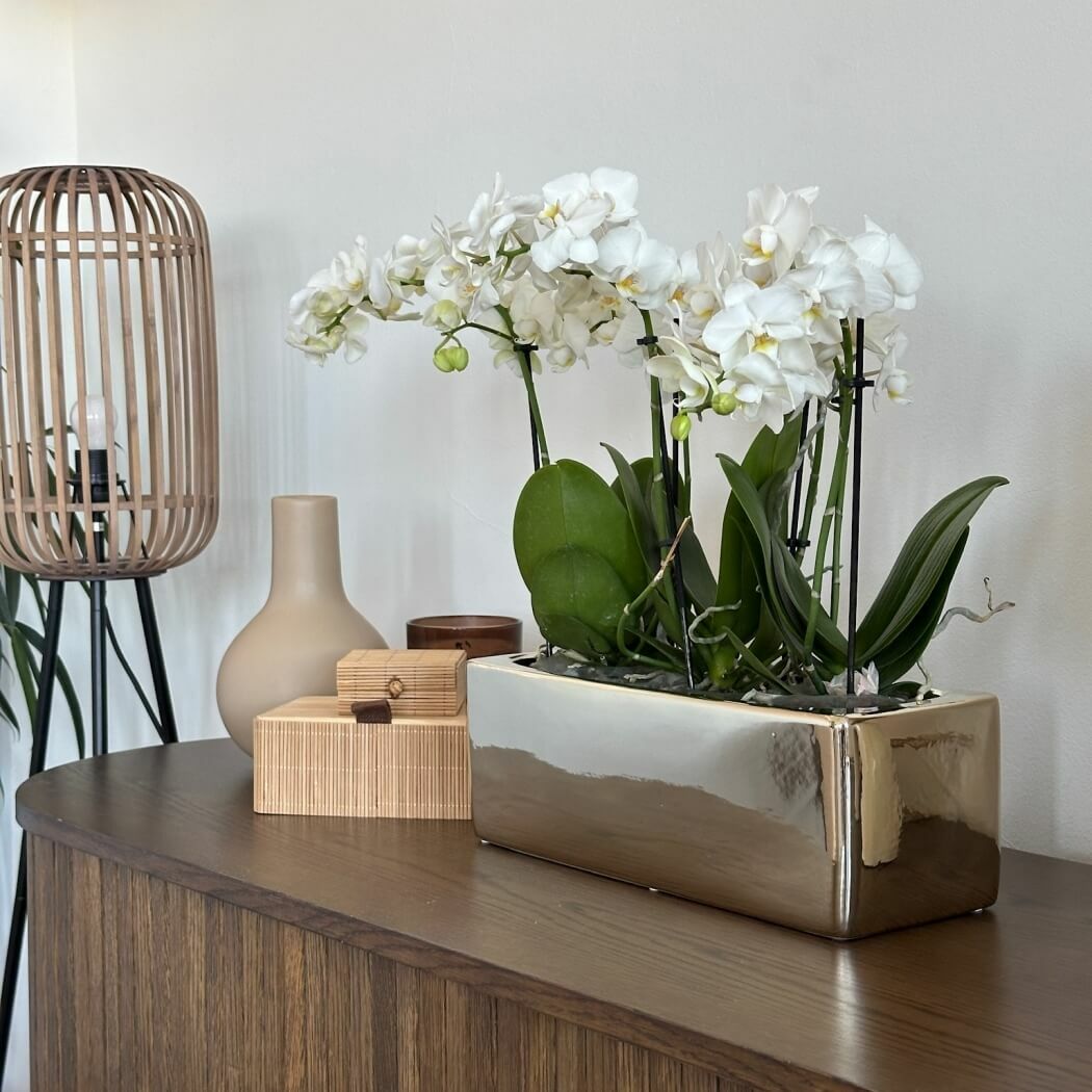 Acest vas ceramic auriu este alegerea perfectă pentru a pune în valoare orhideele și aranjamentele florale moderne. Forma dreptunghiulară alungită și finisajul glazurat auriu conferă produsului un aspect elegant, fiind ideal pentru decorarea meselor, ferestrelor și spațiilor contemporane.