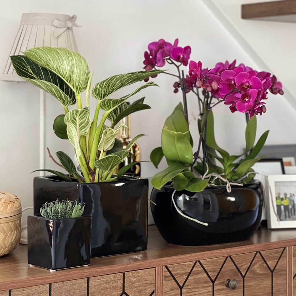 Vas ceramic oval negru lucios, perfect pentru plante decorative și aranjamente moderne. Design modern, finisaj elegant, ideal pentru orice interior.