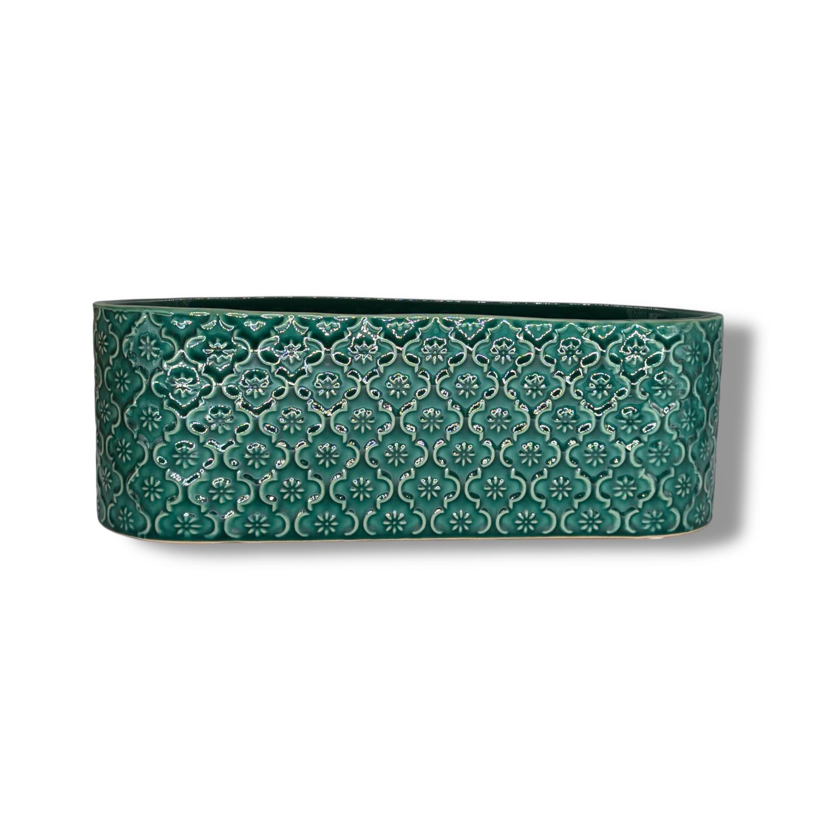 Transformă fiecare aranjament floral într-o piesă decorativă rafinată cu acest vas ceramic vintage oval în nuanță de verde deschis. Modelul reliefat, cu detalii florale fine și finisaj lucios, conferă produsului un aer elegant, perfect pentru decoruri clasice, rustice sau moderne.