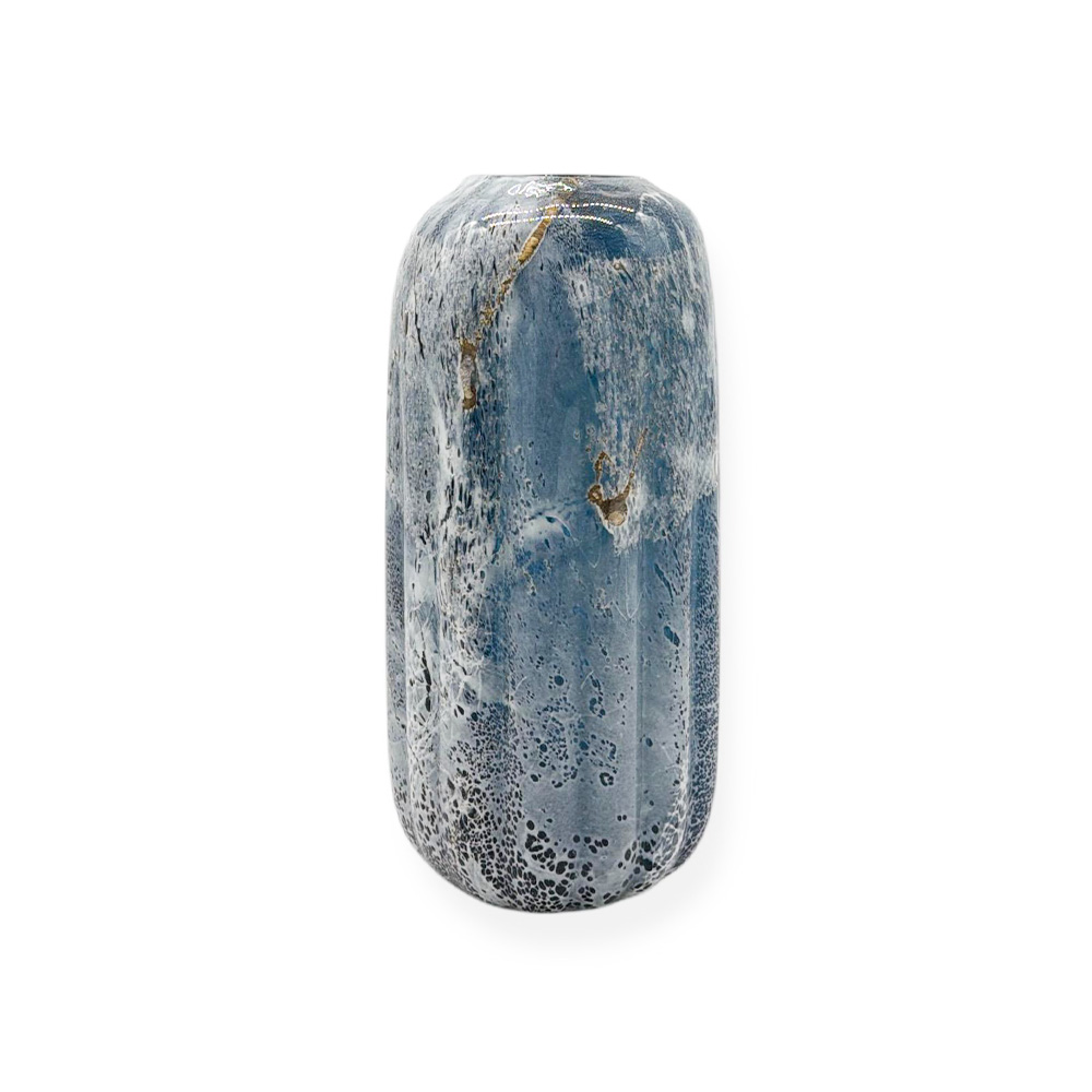 Aceasta vaza cilindrica decorativa din sticla albastra se remarca prin forma sa inalta si designul modern cu finisaj texturat, inspirat din aspectul sticlei lucrate manual. Forma cilindrica alungita este ideala pentru flori cu tija lunga, crengi decorative sau aranjamente florale minimaliste, unde vaza devine un element central de decor.
