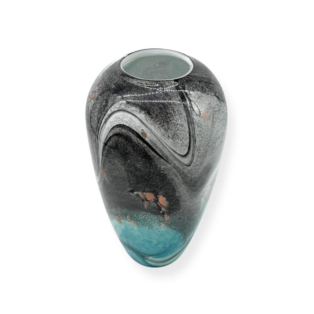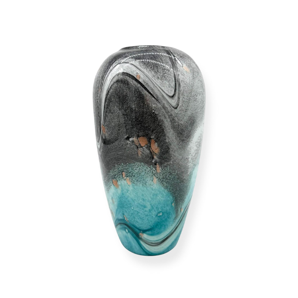 Aceasta vaza din sticla cu forma ovala impresioneaza prin designul sau contemporan si prin combinatia spectaculoasa de culori: turcoaz profund in partea inferioara, tonuri de negru si gri fumuriu in partea superioara, completate de accente subtile cu efect metalic. Modelul fluid si artistic creeaza un efect vizual dinamic, transformand fiecare piesa intr-un element decorativ statement.